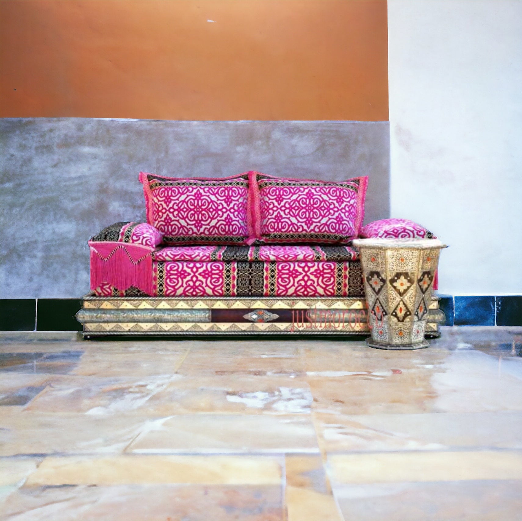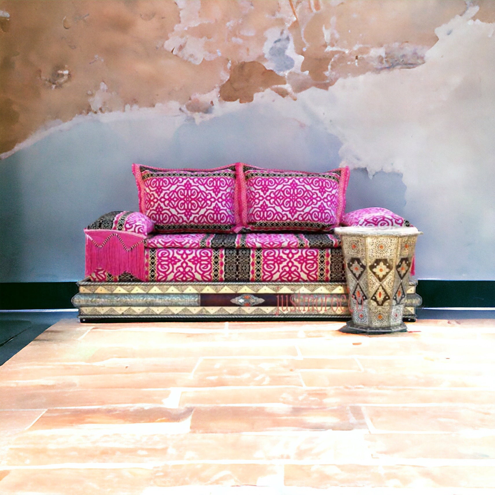 New arrival: A gorgeous moroccan sofa with quality fabric, touareg wooden silver moorish artwork, unique & great workmanship, all handmade in Morocco. This sofa comes with: