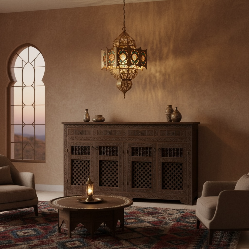 * moorish Influence: The heavy use of metal studs and specific floral or star-shaped carvings often seen on chests brought by Arab merchants.