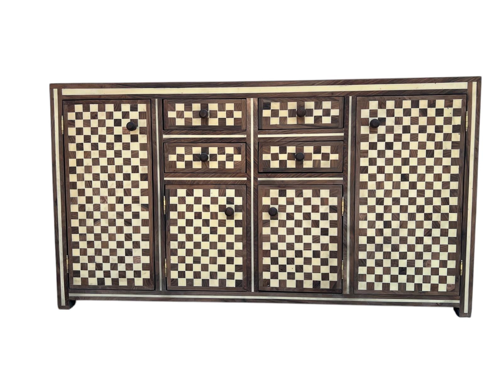 This is a striking piece of furniture! It is a handcrafted sideboard or credenza, made in the tradition of Bone Inlay or Mother of Pearl craftsmanship, which is highly prominent in regions like Marrakech or Essaouira