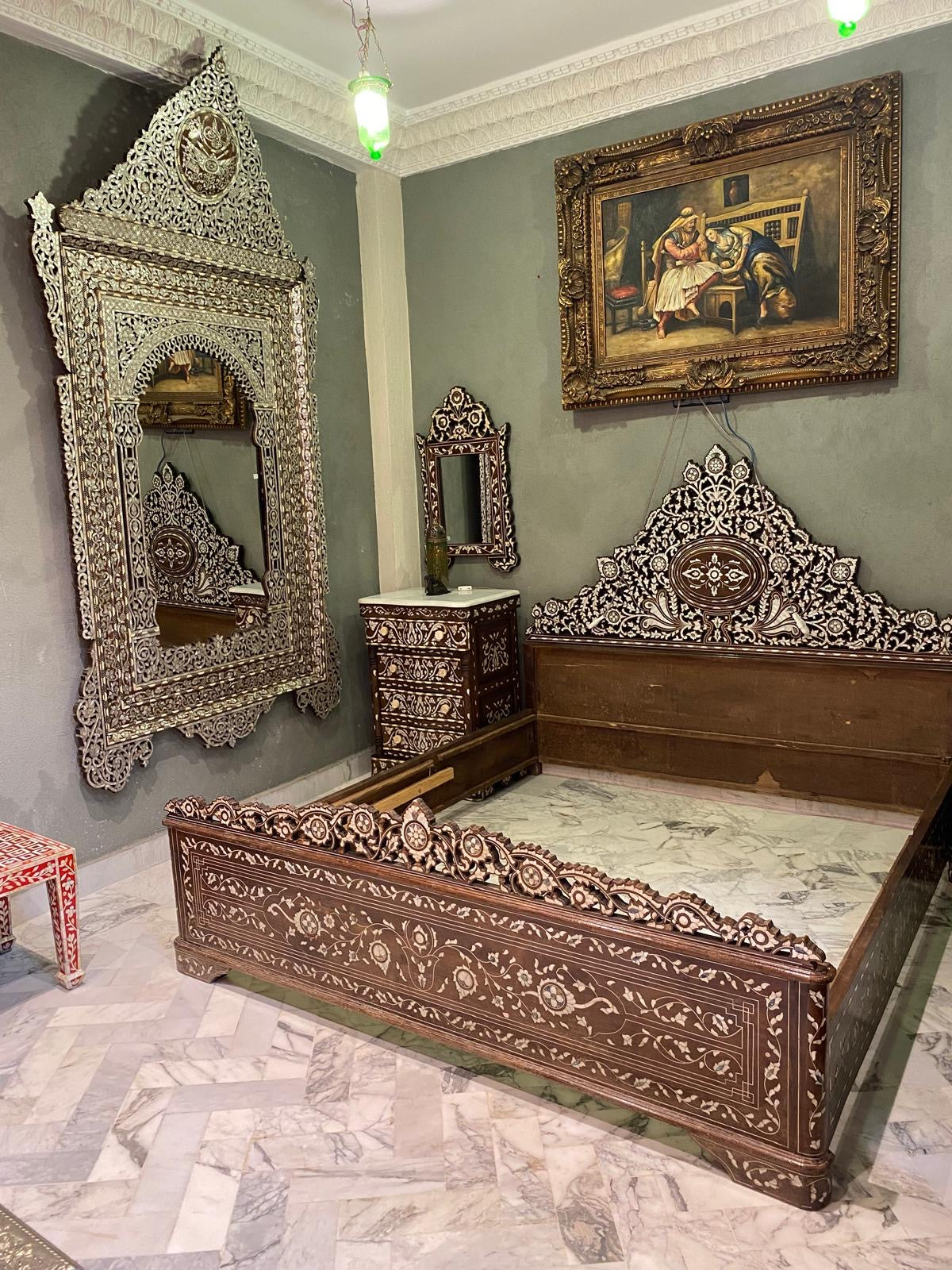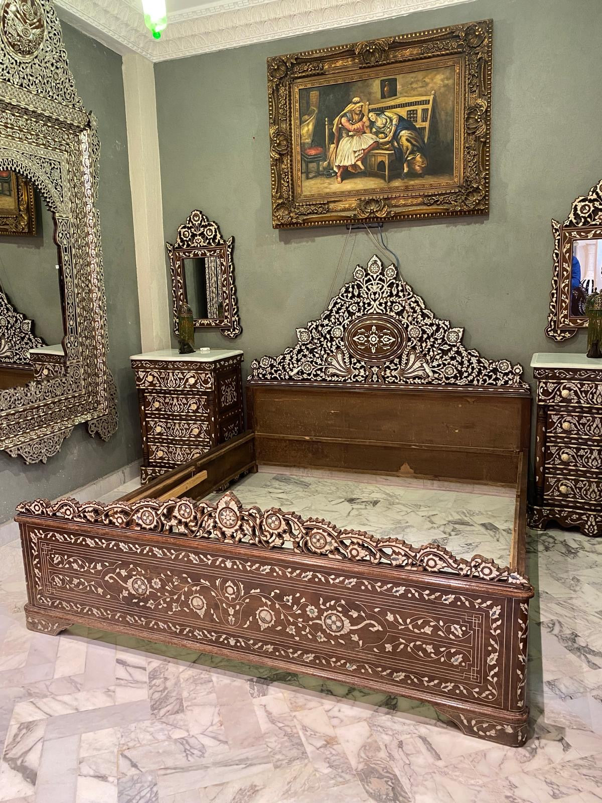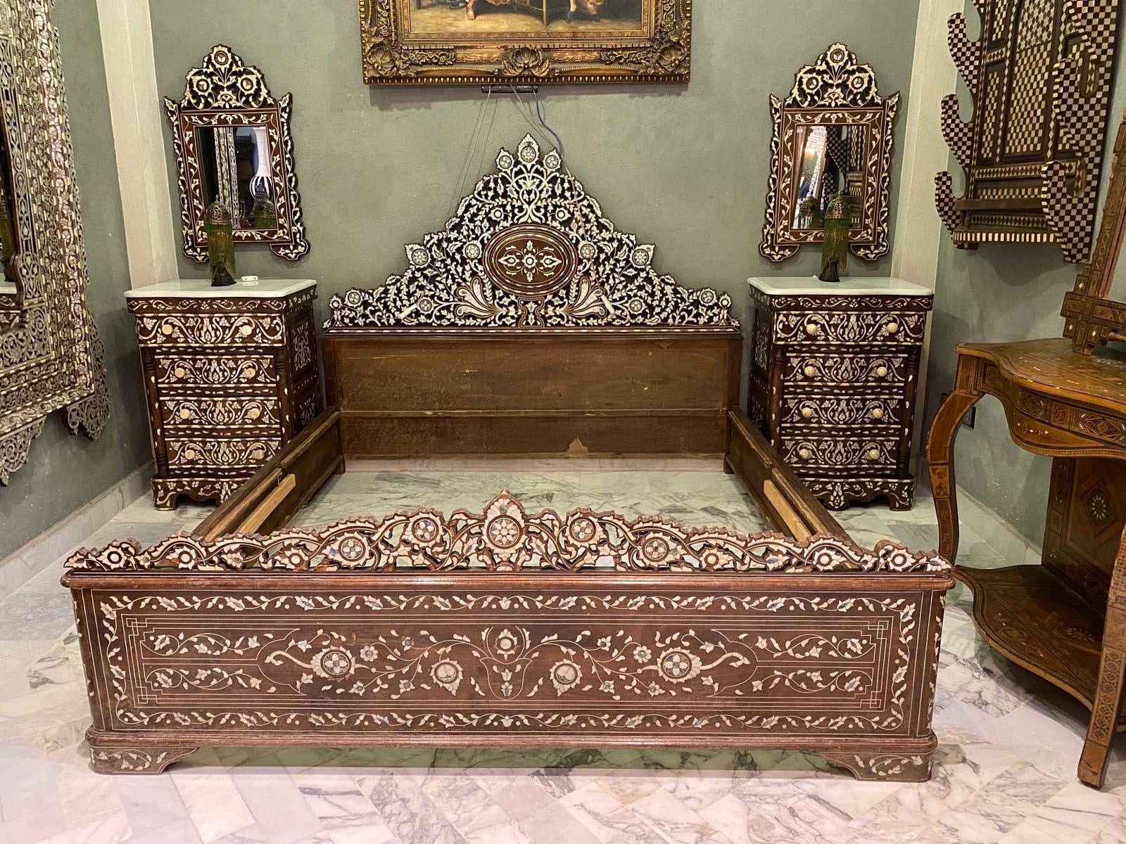 Comes with rails and two vintage mother of pearl & walnut wood nightstands